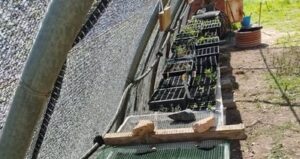 Nos hemos dedicado a adecuar todas las mesas, muy oxidadas, que teníamos bajo el umbráculo. Y subir a ellas las bandejas de semillas que están por germinar. Quedan mejor, aunque nos falta por instalar el futuro riego. También hemos limpiado de objetos y plásticos que andaban pululando. Listo para soportar todas las bandejas que se han ido añadiendo (más sabinas, acebos, Iberis umbellata…) estos últimos meses.