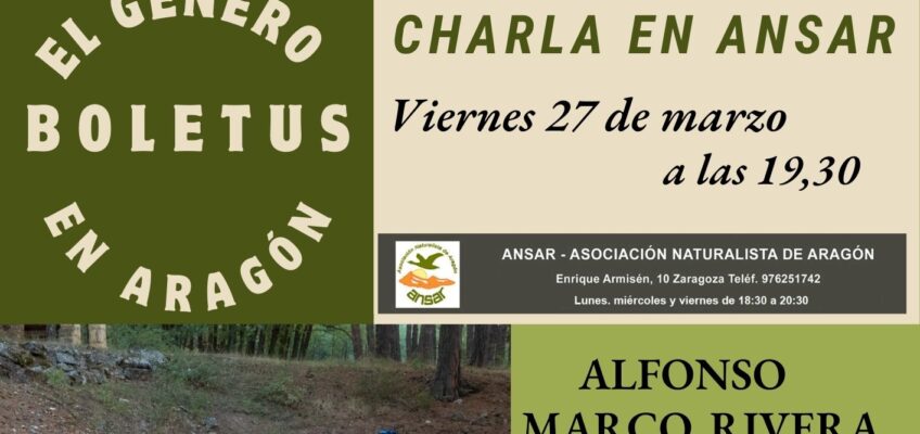 El 27 de marzo, a las 19:30 horas, viene Alfonso Marco, socio del grupo micológico Caesaraugusta desde el año 2007, y ahora perteneciente a la junta directiva del mismo. Ahora se dedica sobre todo a organizar excursiones, montaje de exposiciones y a divulgar sobre micología, con charlas como la que viene a dar.