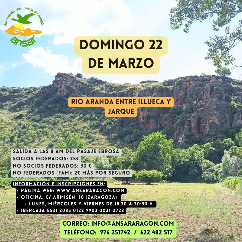 Desde Illueca seguiremos por la senda fluvial que presenta un marcado bosque de galería compuesto por chopos, fresnos, olmos y sauces, con zonas de cañaverales y llegaremos hasta Jarque de Moncayo, donde visitaremos el Centro de Interpretación de la Naturaleza “El Gayán”, donde se nos mostrará la diversidad botánica y la fauna de la comarca, especialmente en la sección dedicada a las aves rapaces, con la esperanza de que podamos avistar algunas durante el recorrido.