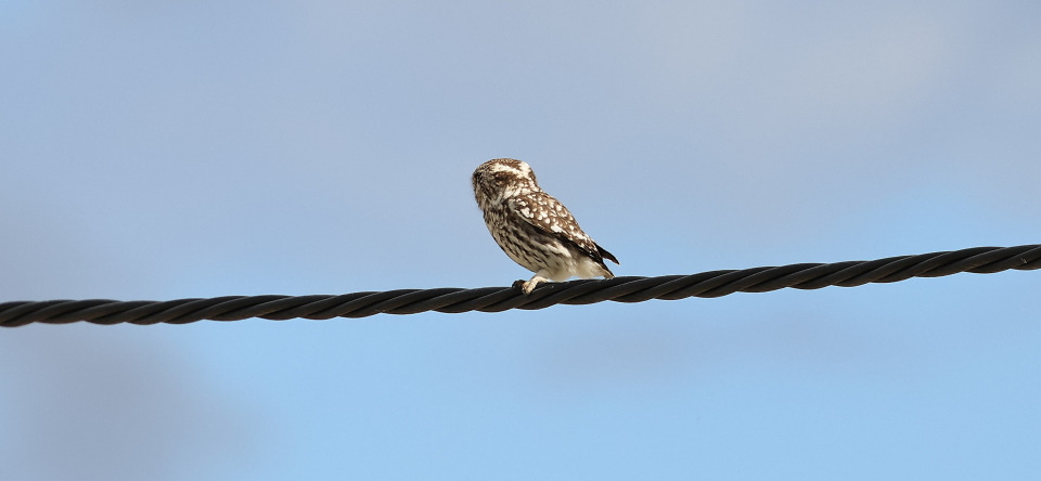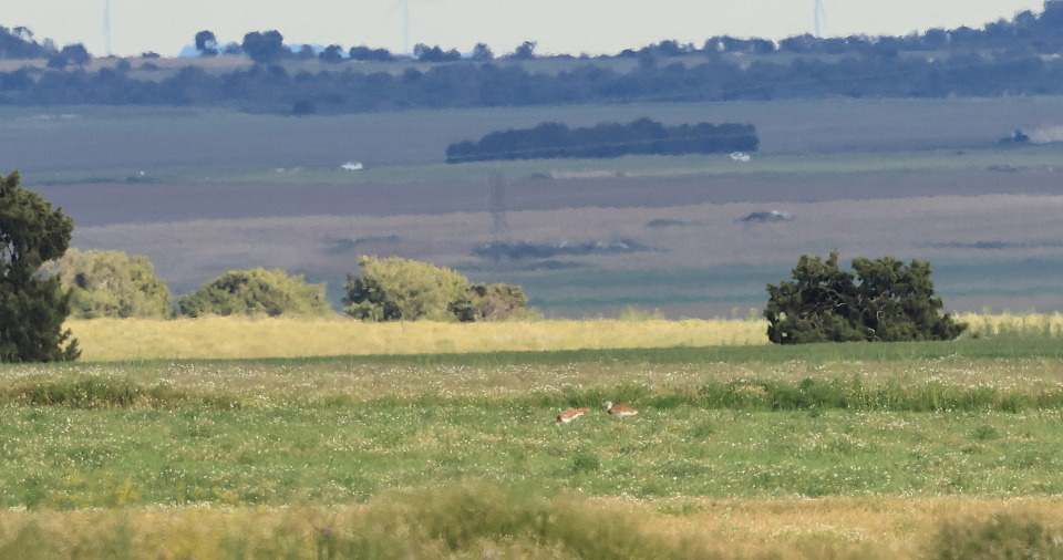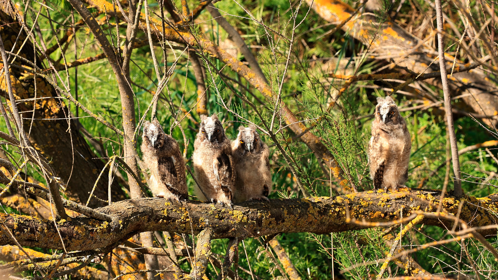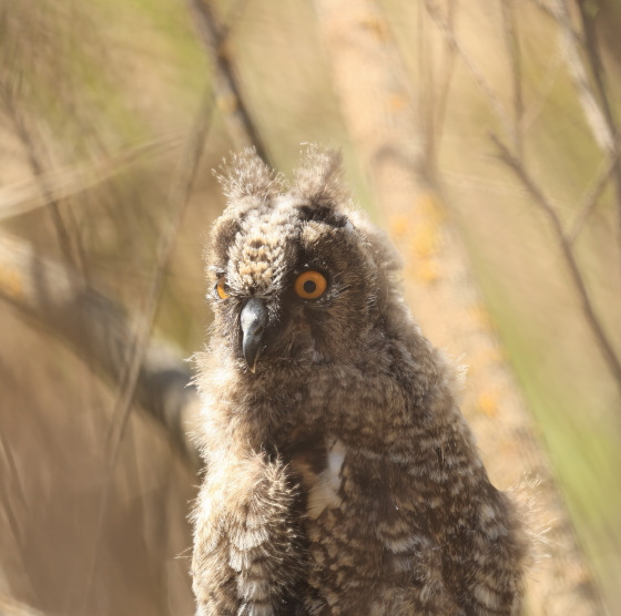 En algún momento (hay que preservar la ubicación de nidos y pollos), pudimos disfrutar en varios árboles de varias polladas de búho chico todavía sin acabar de emplumar. Todos disfrutamos un montón de este momento. De allí partimos a las ubicaciones de sisón que tenía preparadas pero en ninguna de las dos pudimos verlos, probablemente era muy tarde pues se les suele ver en cortejo más bien en las horas bajas de calor y en ese momento era mediodía.