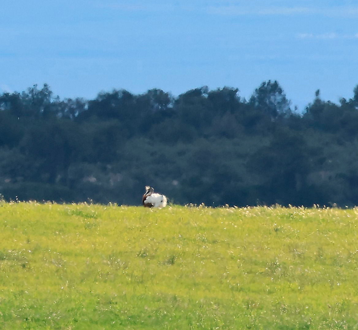 De camino a La Almolda vimos perdices, alcaudón real, águila culebrera y una vez en las faldas de Santa Quiteria cuatro collalbas negras en dos ubicaciones, un cafecito en el pueblo y nos fuimos a la Retuerta a por el prometido espectáculo, el cortejo de la avutarda. Una vez en el punto deseado costó un poco encontrarlas, pero acabamos disfrutando del baño de espuma de dos machos con cuatro hembras en la cercanías, y fue una verdadera suerte porque a esas alturas del mes de abril muchos años el cortejo ya ha terminado. Estuvimos casi hora y media viéndolos ir y venir, comer a ratos y a ratos hacer el llamativo baño de espuma que consiste en girar las alas de modo que se vean las plumas blancas de la parte interior de estas, llamando la atención de las hembras.